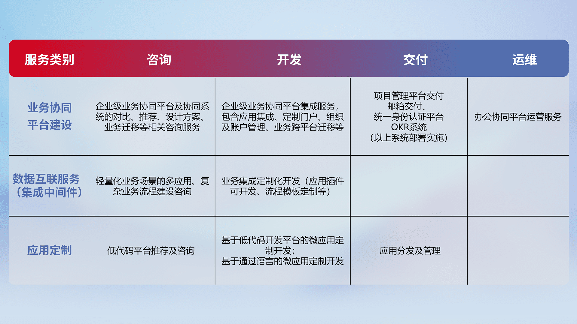 针对钉钉、、企微、、、、IDaas等平台级产品提供产品的规划、、、方案、、交付、、定制化开发等服务,,实现如统一协同办公、、、、智能客户服务、、混合会议管理、、、、智能数据查询、、、等业务场景,,,,实现数字化转型。。